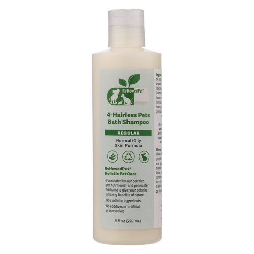 ReNewedPet® 4-Hairless Pets Shampoo: This all-natural pet shampoo is made from only the finest natural, non-gmo and organic ingredients! This shampoo was specifically formulated to care for pets with regular to oily skin. Formulated for unique needs of hairless pets whose skin requires more oil and less soap to moisturize and prevent "re-bound" oil build-up, keeping their skin clean and healthy for longer periods of time between baths. Formulated for best efficacy when used only on hairless pets.